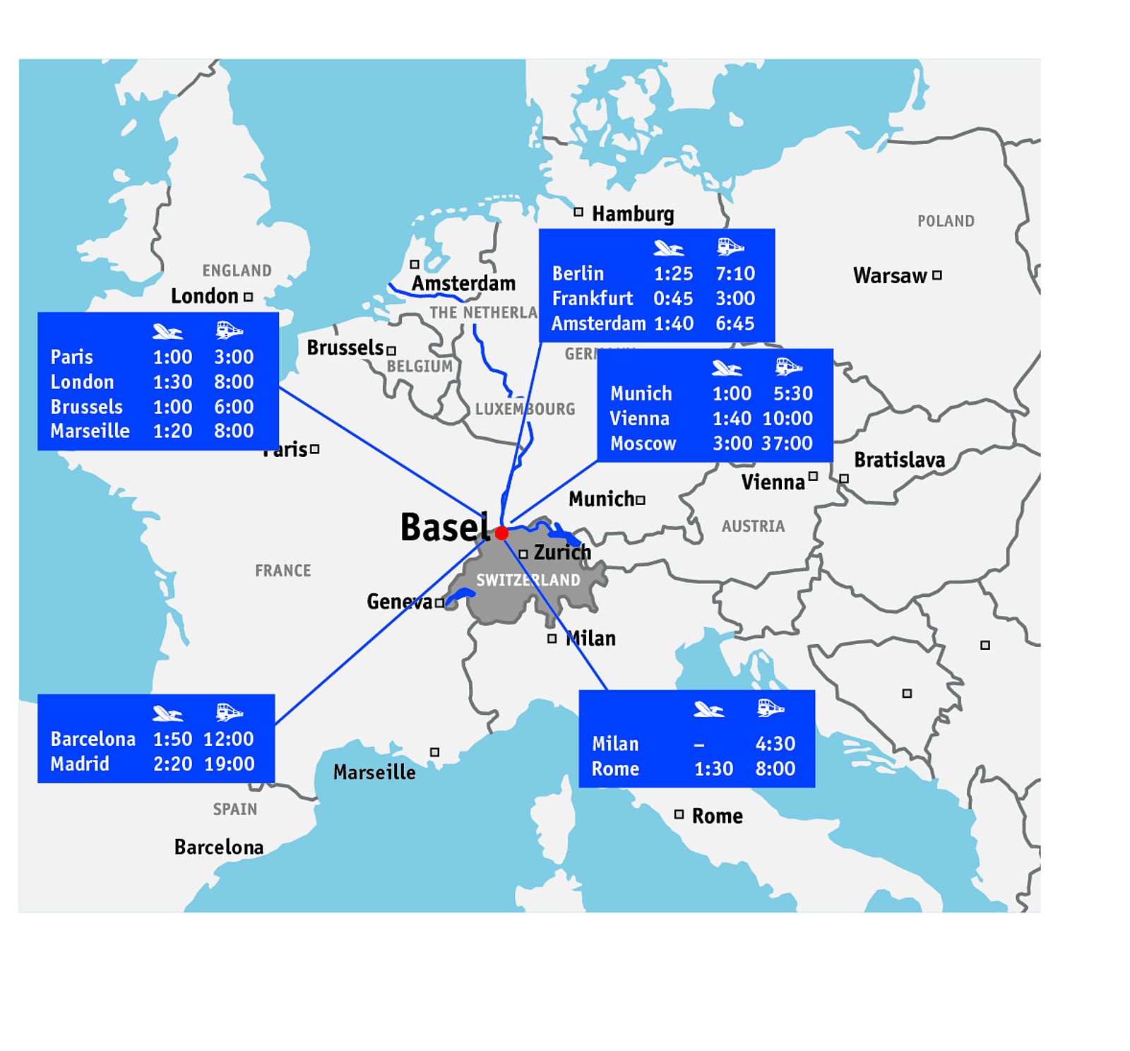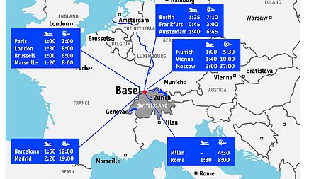 Basel’s EuroAirport, only a 15-minute drive from the city centre and well connected with busses, is served by a number of international airlines. Together with neighbouring Zurich Airport, it offers connections to all European airports and to more than 200 intercontinental destinations.