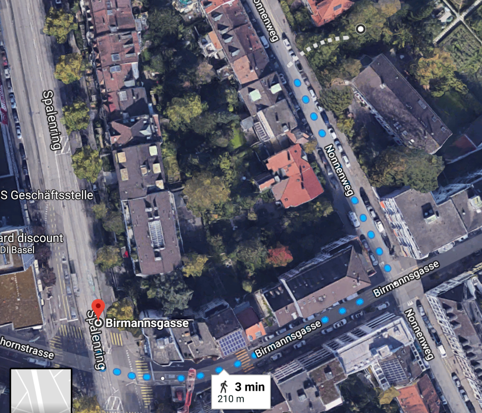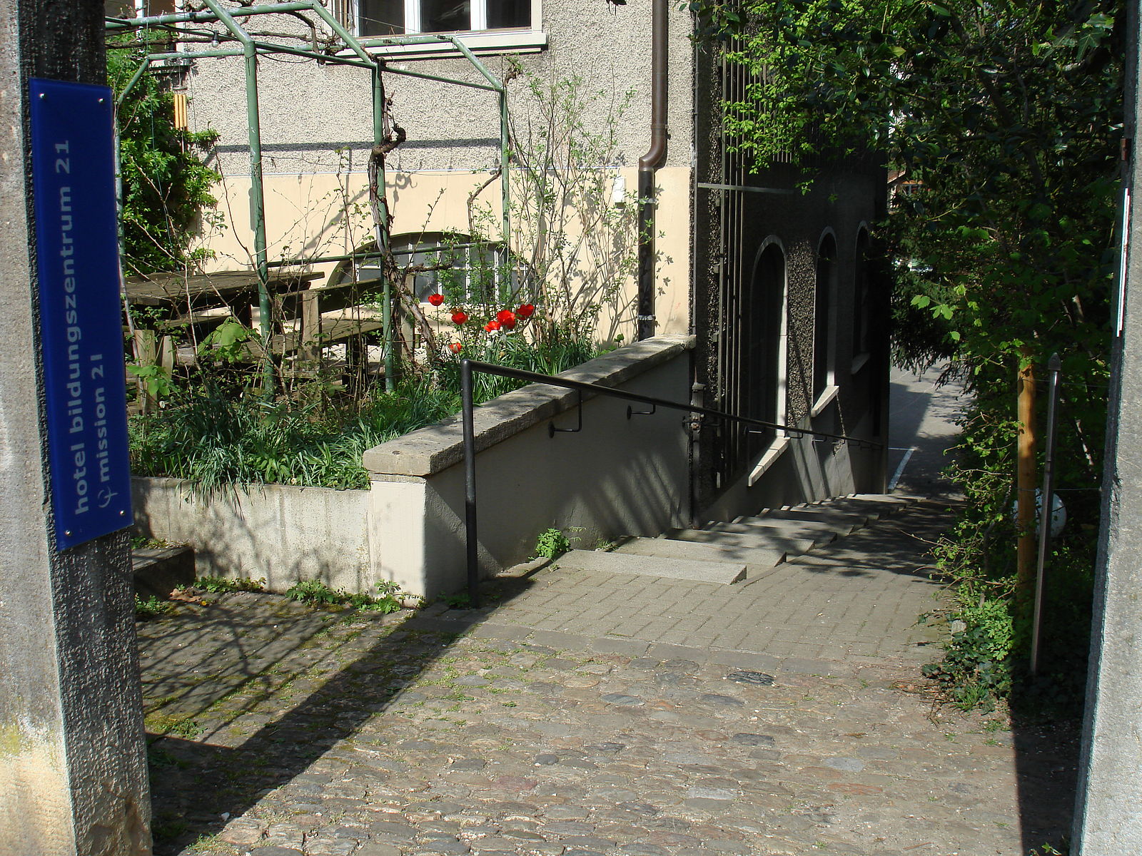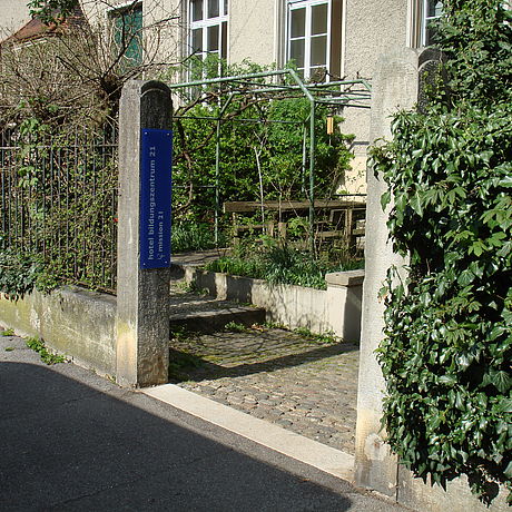 When you get off, on your left you will see street "Birmannsgasse". Walk along "Birmannsgasse" for a few meters, then take the first left onto street "Nonnenweg". After approx. 50 mt. you will see the sign for "Hotel Bildungszentrum 21 Mission 21" (see picture on the right).