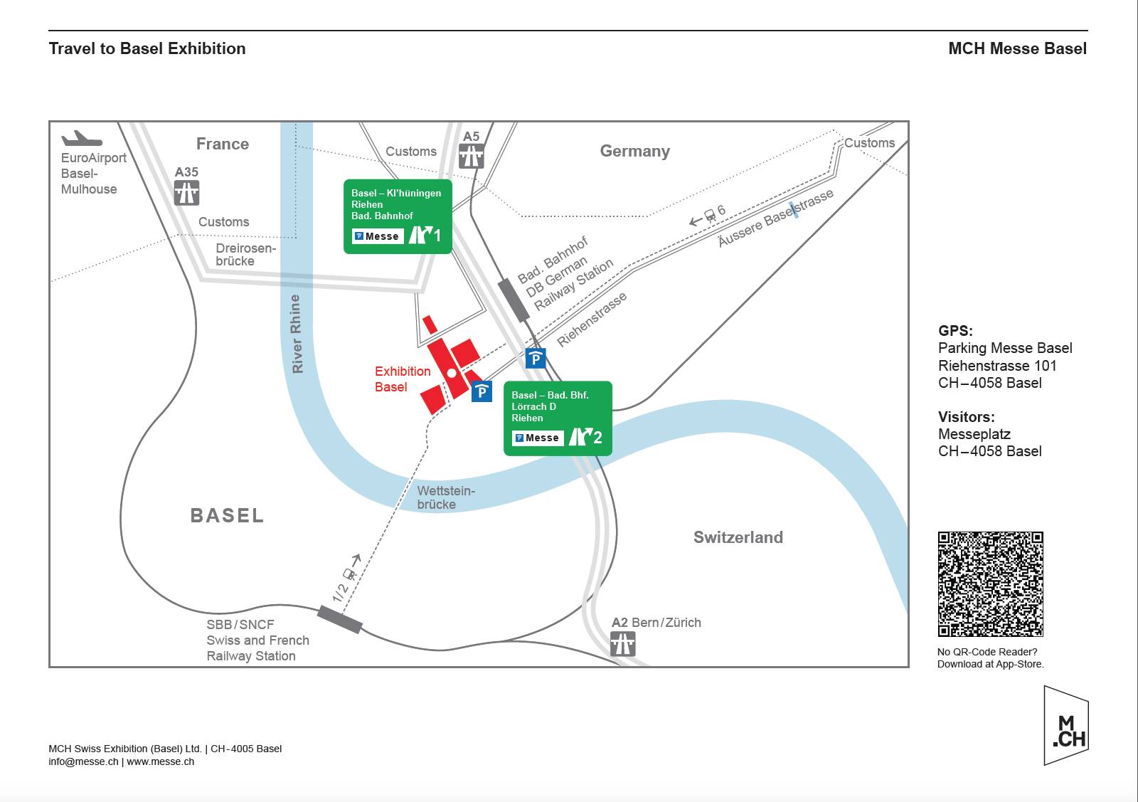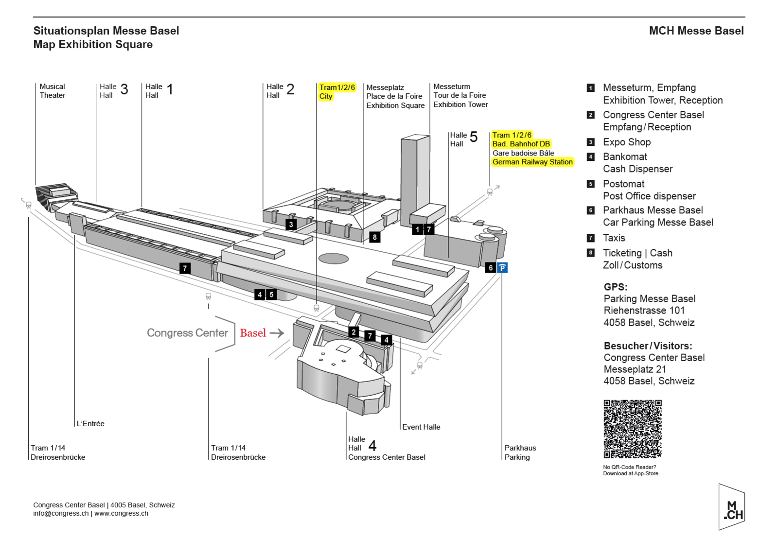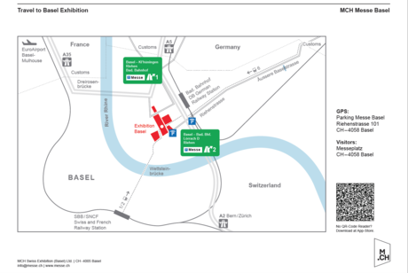The "Messe" exit from the A2 motorway leads directly to the fair and congress ground. There is a multi-storey car park with space for 1'200 vehicles at Exhibition Square. From there follow the signs directing you to the Congress Center Basel.